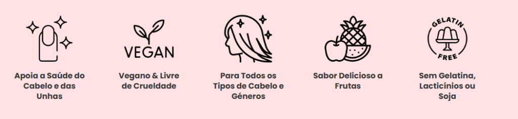 Sente-te mais confiante, com pele luminosa, unhas fortes e cabelo saudável — tudo isto com apenas duas gomas por dia.